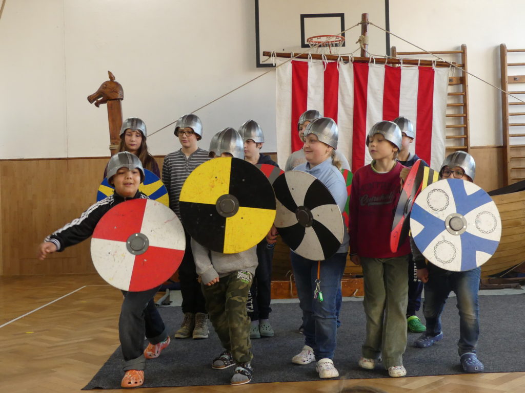 Dne 3. listopadu připlul do naší tělocvičny vikinský drakkar. Vystoupili z něj dva Vikingové, kteří se s žáky podělili o infomace ze svého života – o vikinské společnosti, o vikinských výpravách, o oděvech a zbraních,… Na krátkou chvíli se Vikingy také stali žáci naší školy a prakticky si vyzkoušeli vikinskou válečnou strategii. Vystoupení se všem přítomným líbilo.