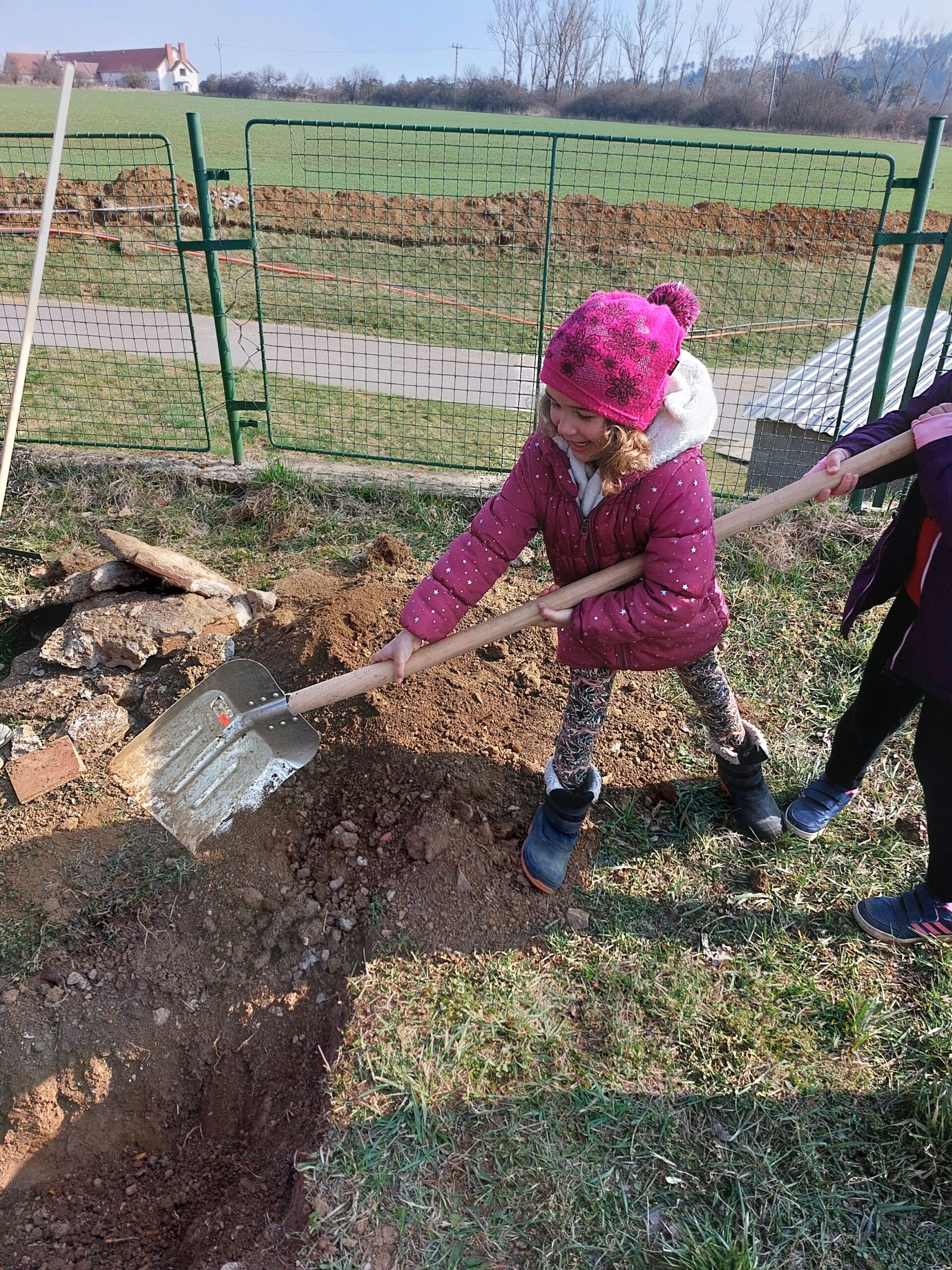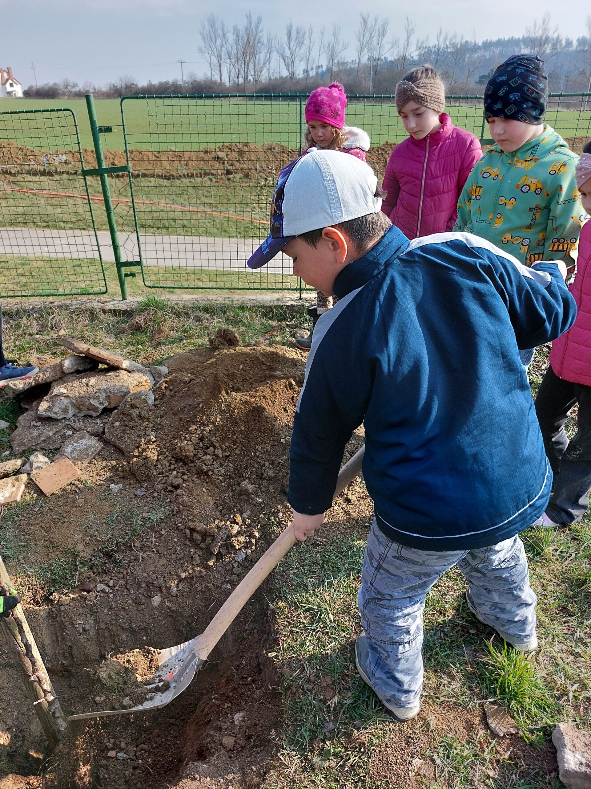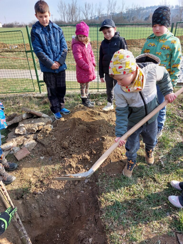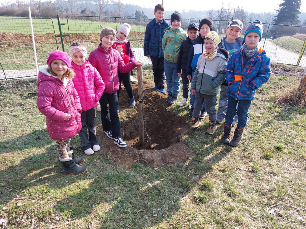 Sázení stromů Žáci prvního ročníku si, jako každý rok, zasázeli svůj ovocný strom. Názorně si ukázali jednotlivé části stromů, poté se pokusili prohloubit jámu a stromek zasadit. Přejeme si, aby stromek krásně rostl.